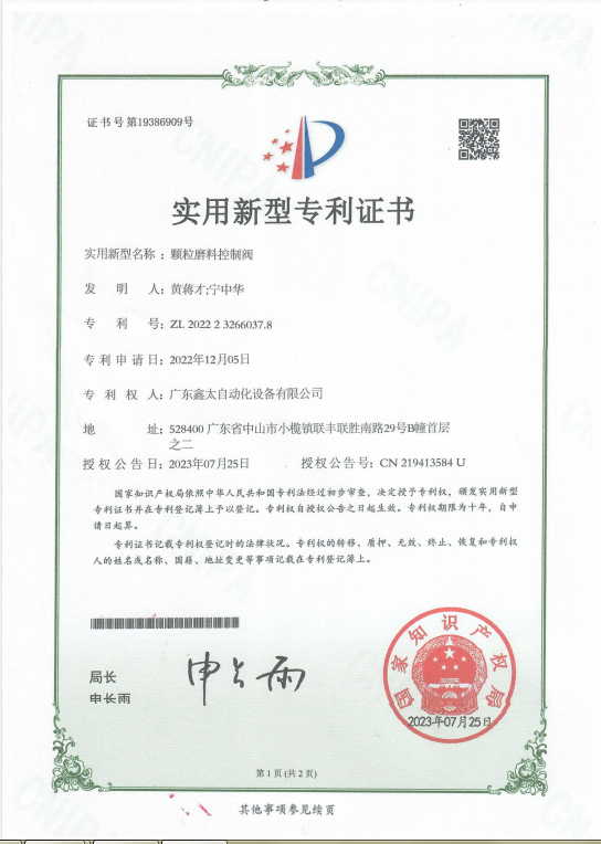 颗粒磨料控制阀-实用新型专利证书