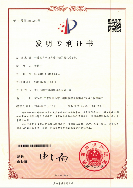 一种具有毛边去除功能的抛丸喷砂机发明专利证书